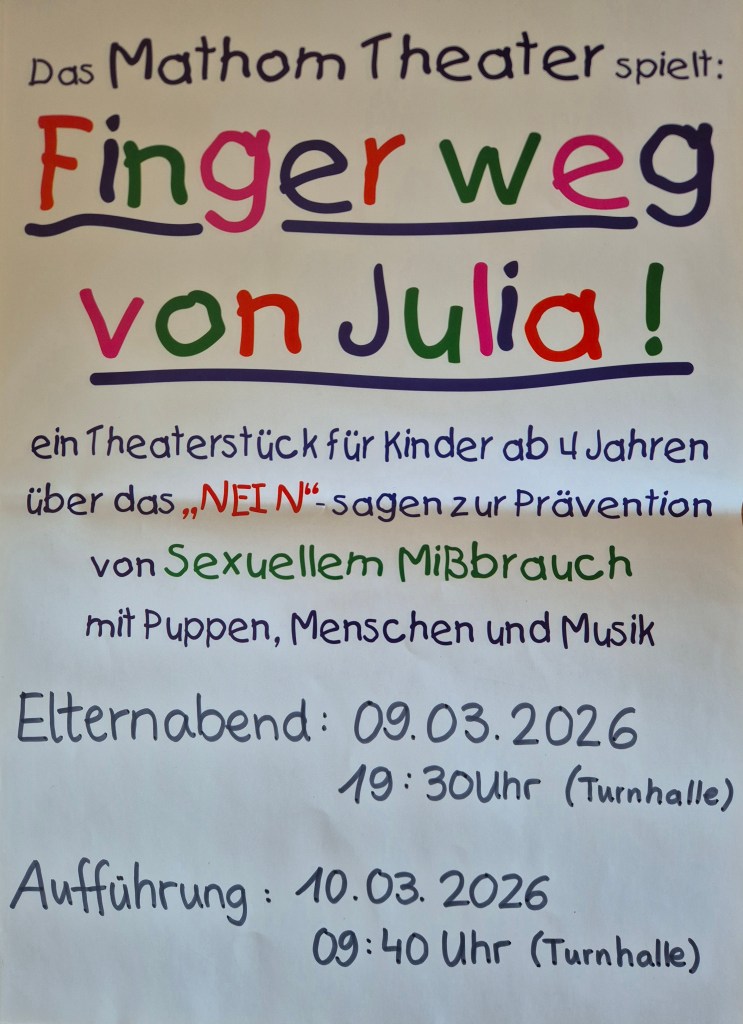 Am nächsten Tag besuchen die Kinder gemeinsam mit Ihren Lehrerinnen die Theatervorstellung. Auch hier ist der Eintritt frei. Durch das Präventionstheater „Finger weg von Julia“ sollen Kinder in ihrer Persönlichkeit gestärkt werden und erfahren, dass sie das Recht haben „Nein“ zu sagen, wenn sie etwas nicht wollen. Die Schülerinnen und Schüler erhalten in einer kindgerechten und für sie verständlichen Form Informationen über Missbrauch. Informationen über das Theaterstück gibt es im Internet unter www.mathomtheater.de.
