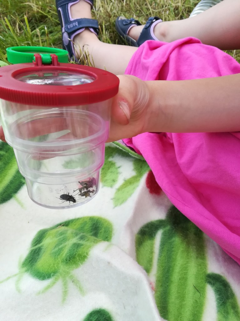 Dann schnappten sich die Kinder die Becherlupen und gingen auf Entdeckungsreise. Spinnen, Käfer, Tausendfüßler und alles was da kreucht und fleucht wurde behutsam aufgenommen und voller Staunen betrachtet.