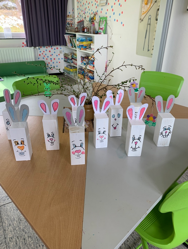 Es beginnt die Frühlingszeit und die Vorfreude auf die Osterferien, auf den Osterhasen und die damit verbundene Geschenke! Um die Wartezeit bis zu den Osterfeiertagen zu verschönern, haben wir uns in der Betreuung etwas für die Kinder der Grundschule einfallen lassen. Aus zurechtgeschnittenen Holzstücken bastelten die Kinder zusammen mit Betreuungskraft Frau Helwig bunte Osterhäschen. Sie verzierten die leeren Holzklötze mit lustigen Gesichtern und klebten anschließend die langen Hasenohren dran. Hierbei ließen die Kinder ihrer Kreativität freien Lauf und jedes Häschen wurde auf seine Art etwas Besonderes. Mit Gabeln und Acrylfarbe verwandelten die Kids leere DIN A4 Blätter zu einem süßen Häschen! Mit dieses und weiteren Bastelideen verschönerten wir uns die Vorfreude auf das bevorstehende Osterfest. Wir wünschen allen Kindern der Pestalozzi-Grundschule und ihren Familien eine wundervolle Osterzeit!