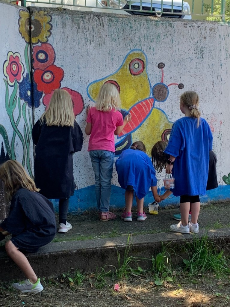 Höchste Zeit die verblassten Malereien an der Mauer zum Pausenhof aufzufrischen machten sich die Kinder mit Malerbedarf auf den Weg! Durch die Anleitung von Frau Leiser wurden die Schüler motiviert ihren Schulhof mit Hilfe von bunten Farben und viel Kreativität zu verschönern. Alle Kinder hatten einen riesigen Spaß. Die Mauer erstrahlt im neuen Glanz – dank der fleißigen, kleinen Helferchen konnte Frau Leiser die Arbeiten zügig voran bringen. Jetzt macht das Spielen auf dem Schulhof gleich noch mehr Spaß!