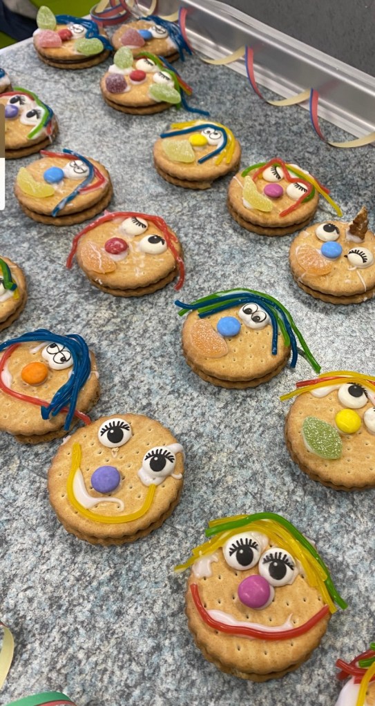 Die fünfte Jahreszeit ist wohl die bunteste überhaupt. Nicht nur die Fenster der Pestalozzi-Grundschule sind in der Nachmittagsbetreuung dieses Jahr bunt in Szene gesetzt worden – auch die Küche verwandelt sich in der Karnevalszeit in eine fröhliche/bunte Backstube! Zusammen mit den Kindern tüftelten Fr. Helwig und Fr. Eckstein in der Nachmittagsbetreuung an den bunten Karnevalsplätzchen. Mit buntem Zuckerguss, Gummibärchen und Smarties verzierten die Kinder ihre Plätzchen zu lustigen Gesichtern.