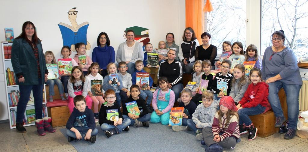 Doch damit noch nicht genug. Denn nun galt es ja auch neue Bücher anzuschaffen. 500 Euro waren dafür dankenswerter Weise von der VR Bank Hessenland gespendet worden. Jetzt waren auch die Kinder gefragt, denn sie durften die Bücher für „ihre“ neue Bibliothek selber aussuchen. Keine Frage, dass so ein buntes Sortiment passender kindgerechter Literatur zusammen kam. Als Lieferant hatte man die Buchhandlung Homberg gewählt, die ebenfalls dankenswerter Weise ihrerseits das Sortiment noch mit weiteren Buchspenden ergänzte.