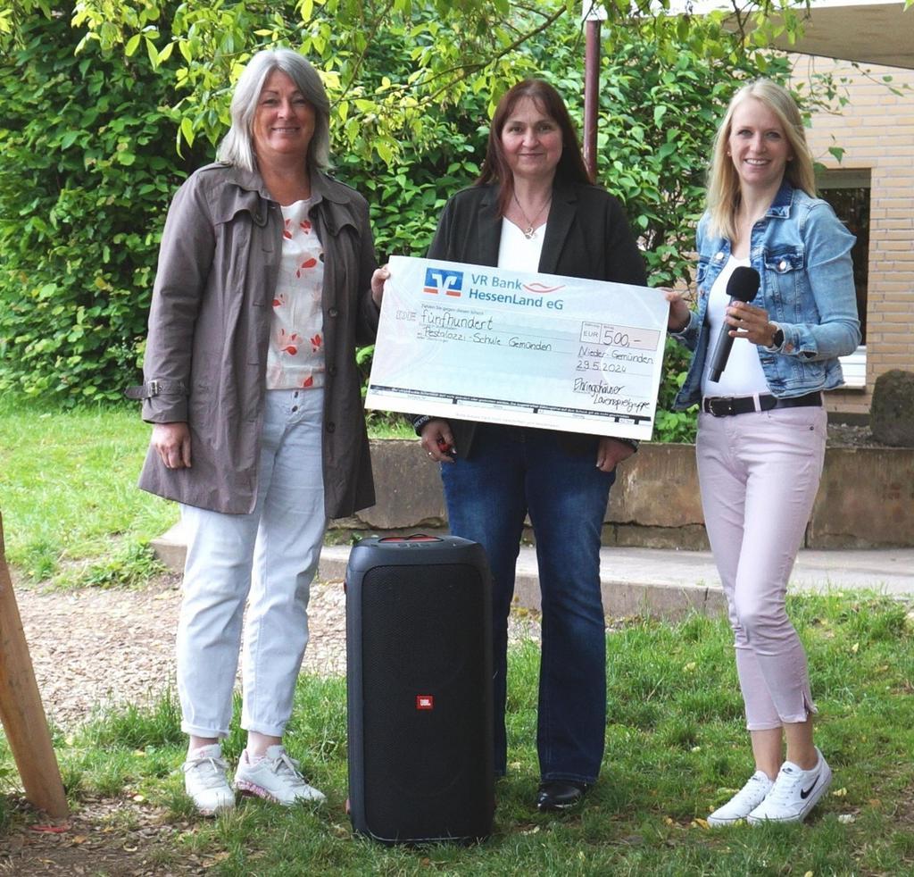 Gemünden (eva). Die Vorstandsmitglieder der Ehringshäuser Laienspielgruppe Andrea Hausmann und Dunja Werneburg überreichten letzte Woche offiziell eine Spende von 500 Euro an den Förderverein der Pestalozzischule in Gemünden. Schulleiterin Yvonne Dechert, die in Vertretung für die Vorsitzende des Fördervereins Yvonne Schmidt den obligatorischen Spendenscheck entgegennahm, dankte für die großzügige Spende, für die nach vorheriger Vereinbarung mit der Laienspielgruppe bereits eine JBL Partybox mit Mikrofon für die Schule angeschafft wurde. „Die Box können wir nun sowohl im Innen- als auch im Außenbereich der Schule für Reden, Aufführungen von Theaterstücken, in Musikpausen, im Sport- und Musikunterricht und vielem mehr einsetzen“, freut sich Schulleiterin Yvonne Dechert.