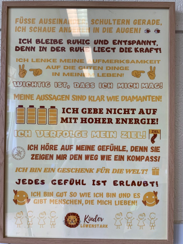 Wir hatten Besuch von Petra Herr, die für uns ihr Selbstbehauptungs- und Resilienztraining „Kinder Löwenstark“ mitgebracht hat. In diesem dreitägigen Training haben wir spielerisch lernen können, wie wir mutig und selbstbewusst auftreten, wie wir damit umgehen, wenn uns jemand ärgern möchte, und dass unsere Meinung über uns selbst viel wertvoller und wichtiger ist als das, was andere über uns denken. Wir gehen gestärkt, mutig und mit vielen neuen Tipps und Tricks aus diesem Training und bedenken uns noch einmal herzlich bei Petra für die wertvolle und lehrreiche Zeit.