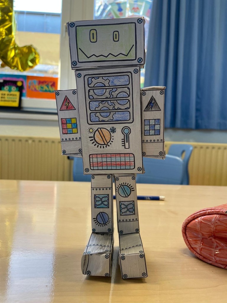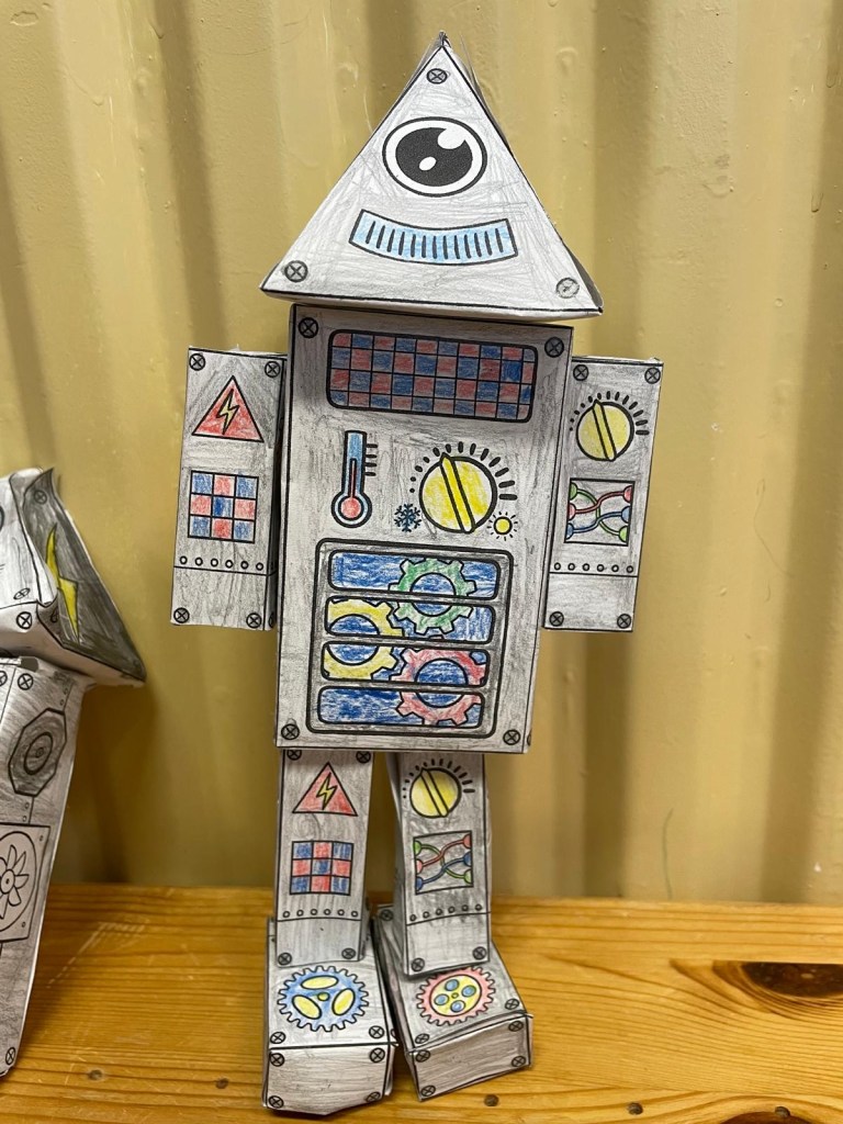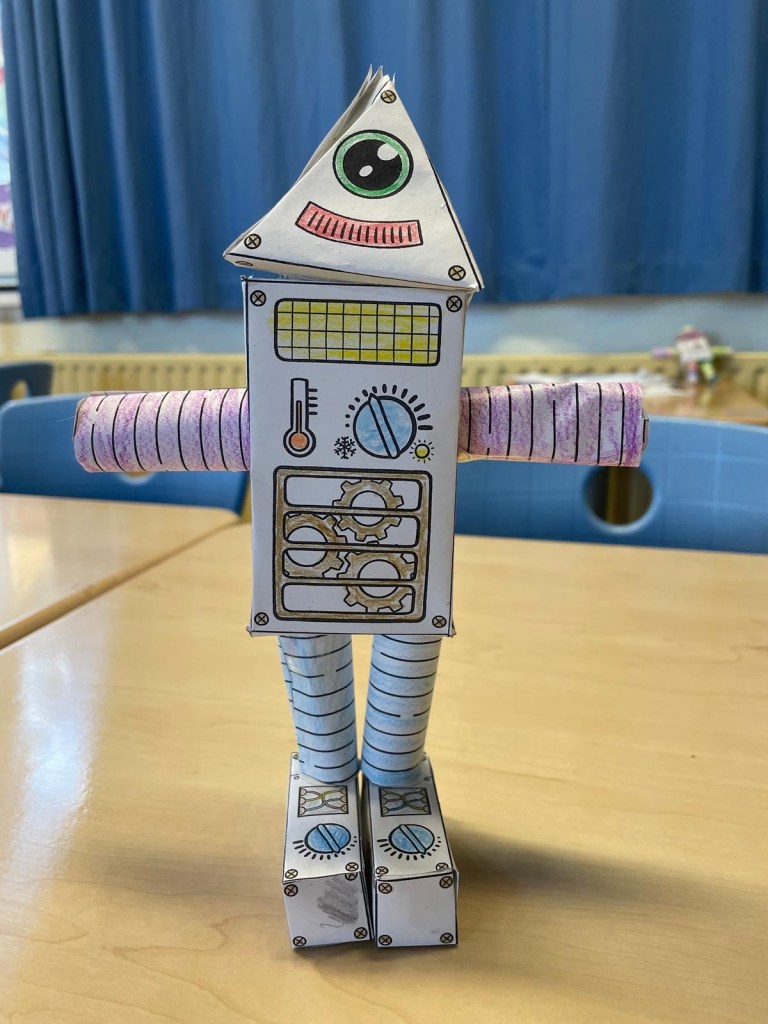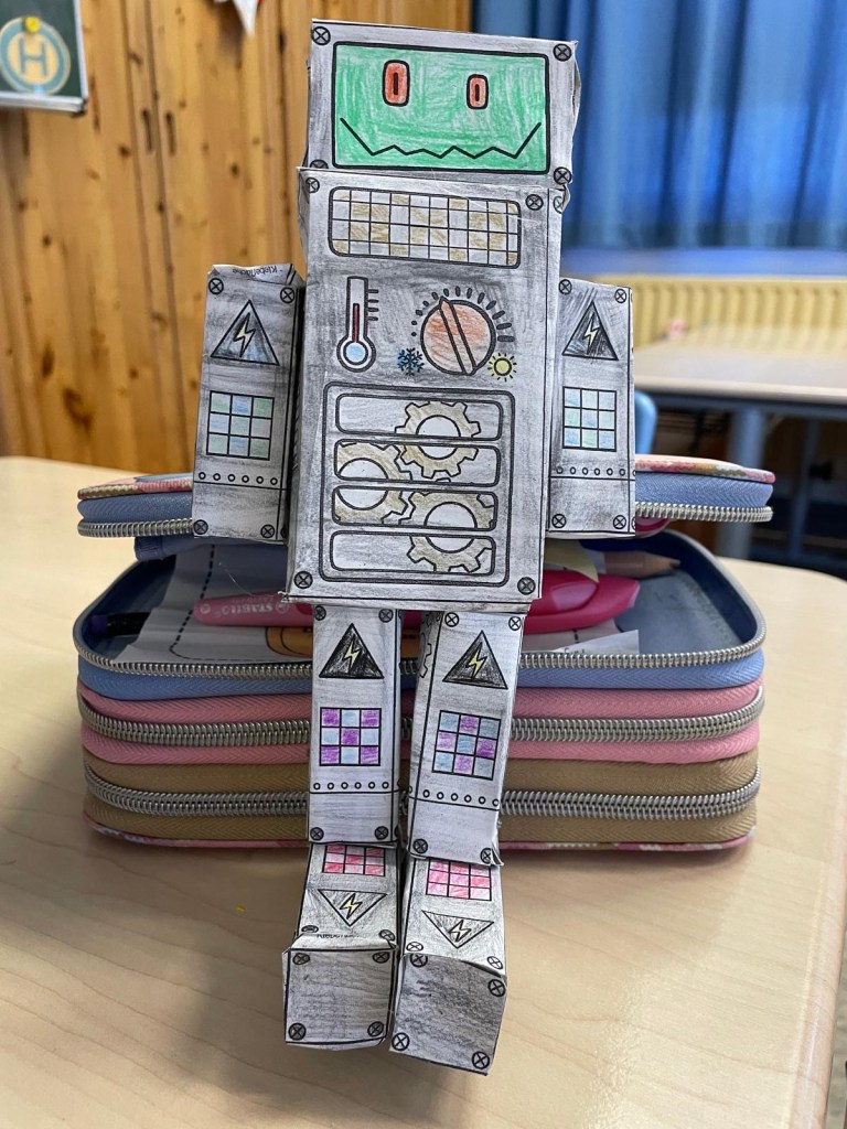 Im Matheunterricht haben wir geometrische Körper kennengelernt und sie genauer hinsichtlich ihrer Eigenschaften untersucht. Passend dazu haben wir Roboter aus geometrischen Körpern gebaut. Die Ergebnisse können sich wirklich sehen lassen.