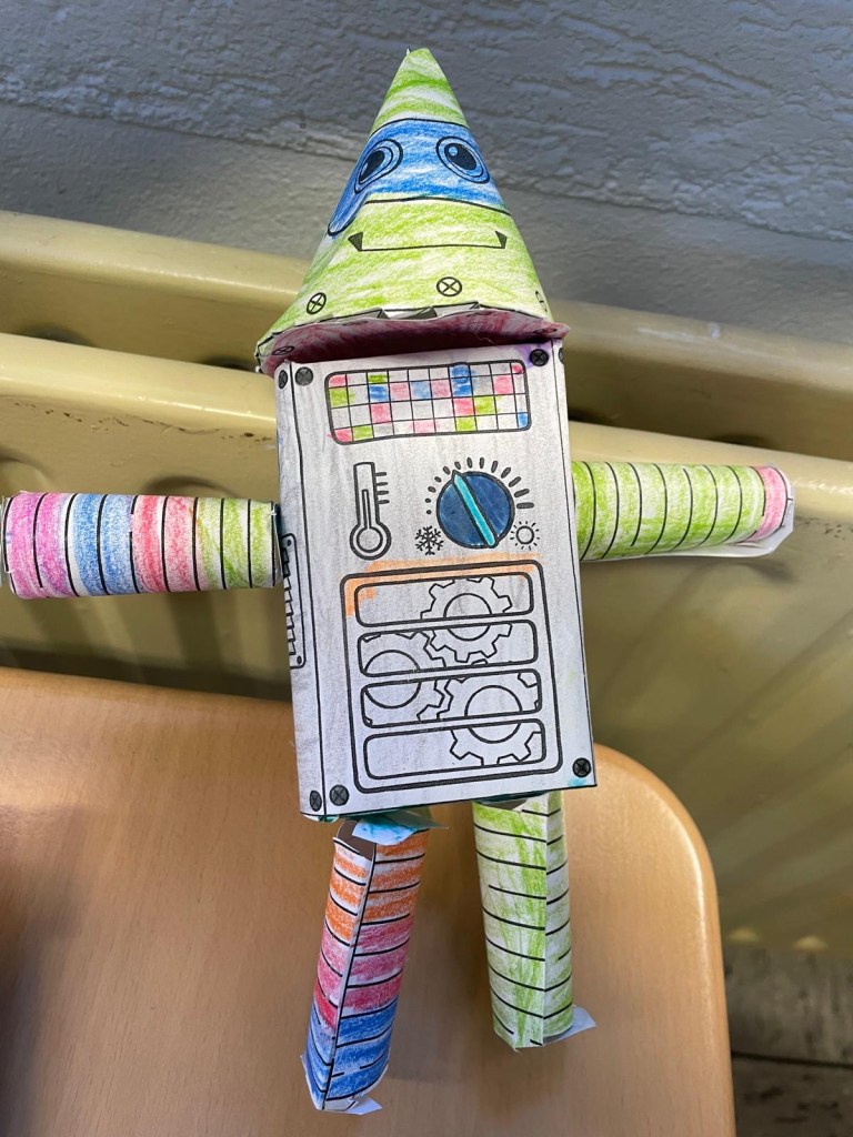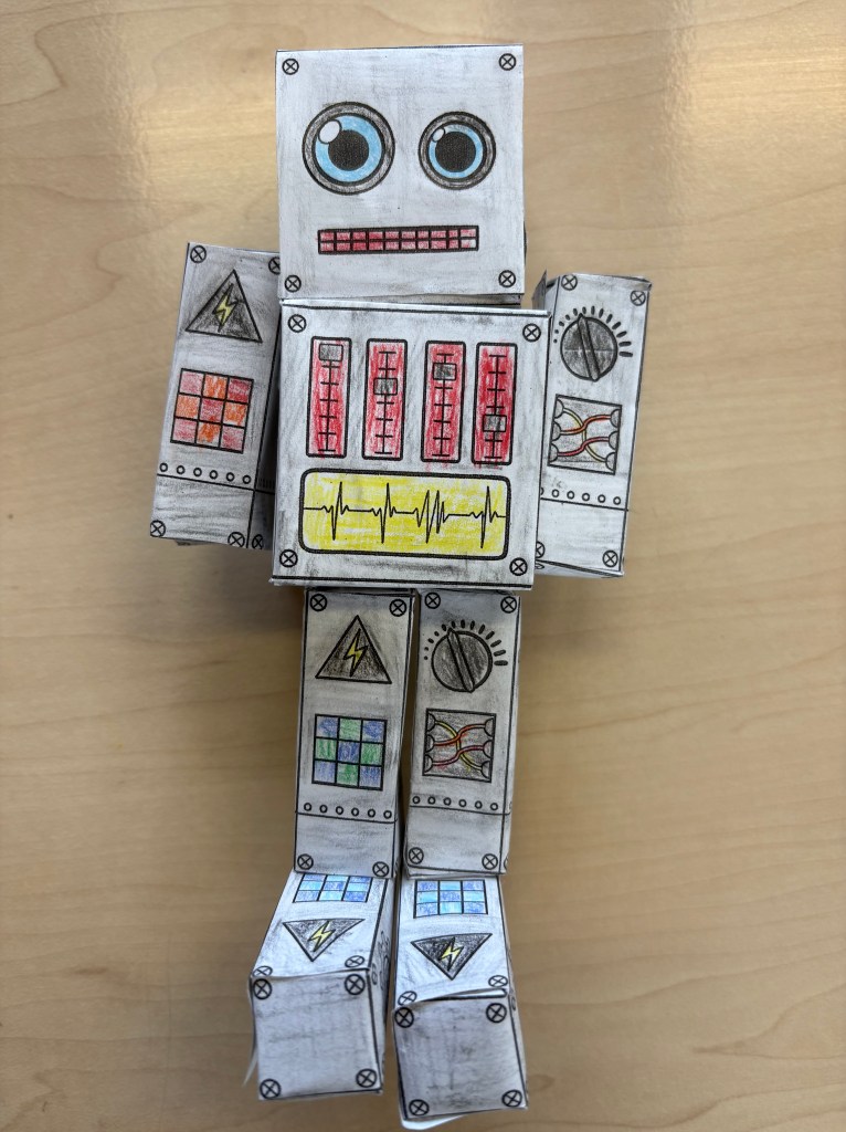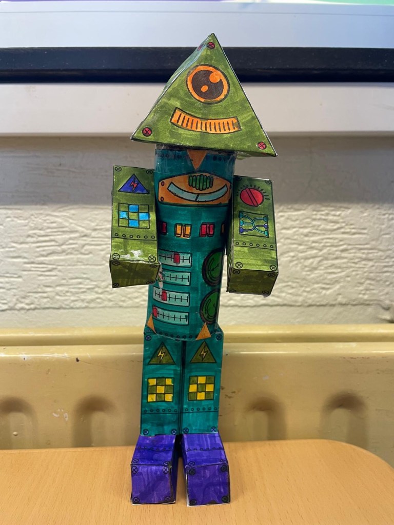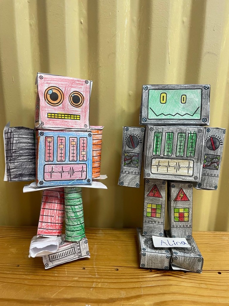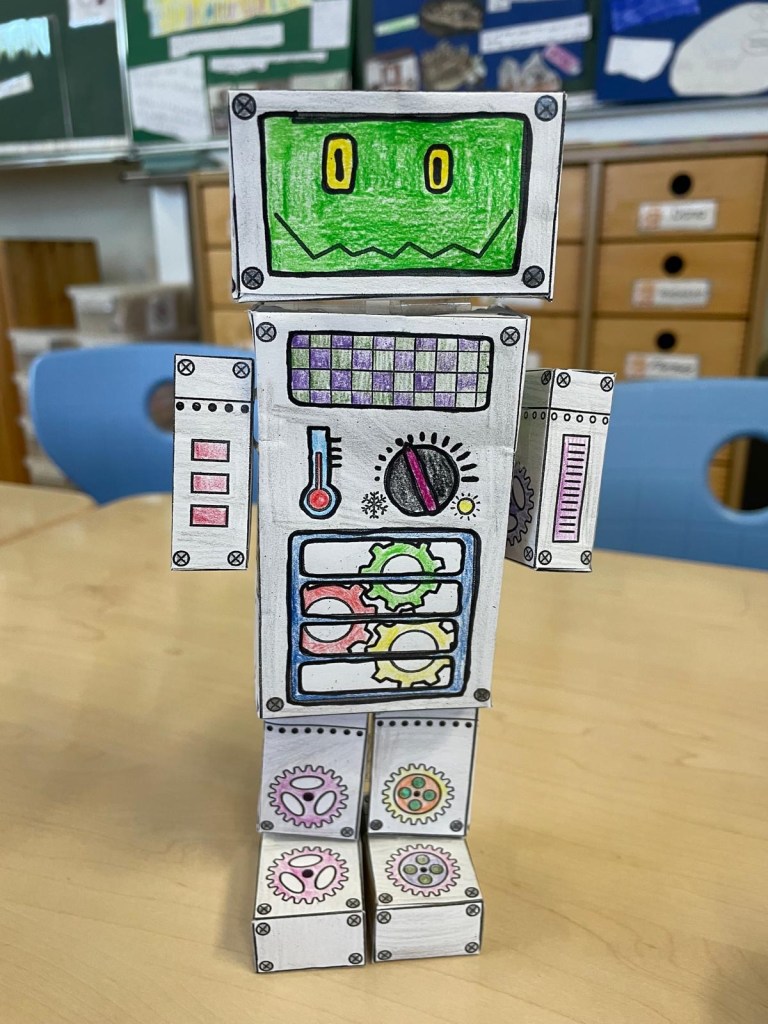 Im Matheunterricht haben wir geometrische Körper kennengelernt und sie genauer hinsichtlich ihrer Eigenschaften untersucht. Passend dazu haben wir Roboter aus geometrischen Körpern gebaut. Die Ergebnisse können sich wirklich sehen lassen.