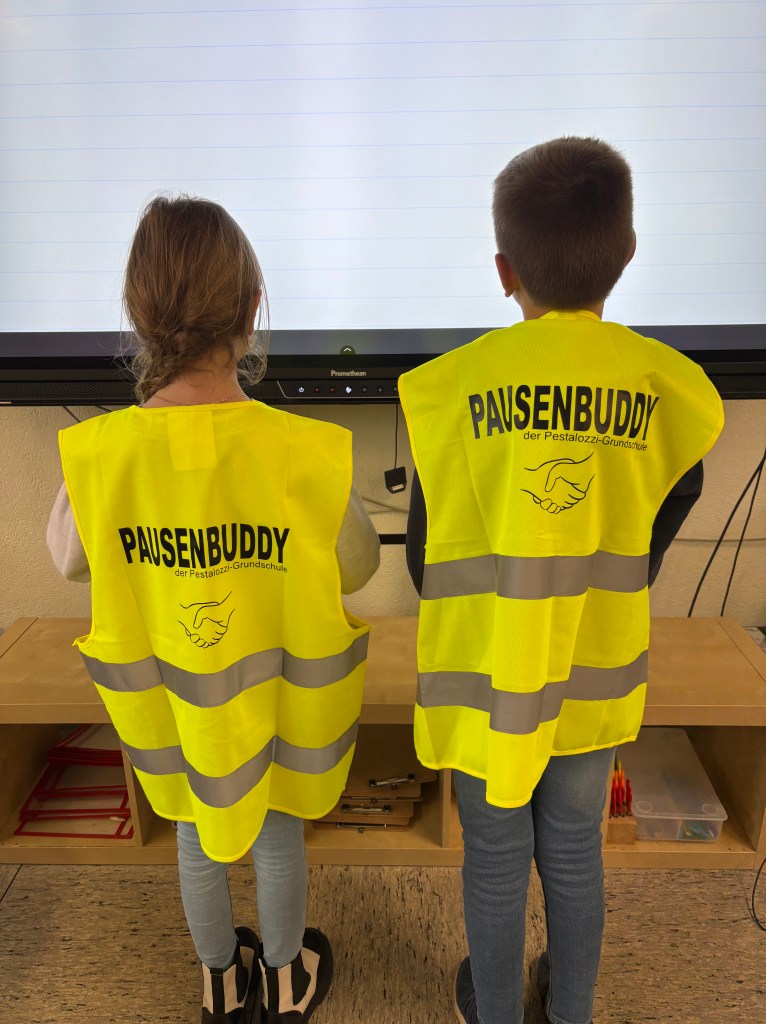 Seit den Herbstferien unterstützen wir in den Pausen als Pausenbuddies. Dabei sind wir für die Kinder ansprechbar und helfen bei Problemen. Über unsere Arbeit reflektieren wir im Klassenrat, um unsere Unterstützung immer weiter zu verbessern.