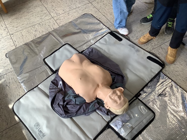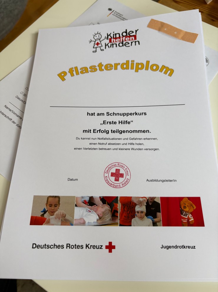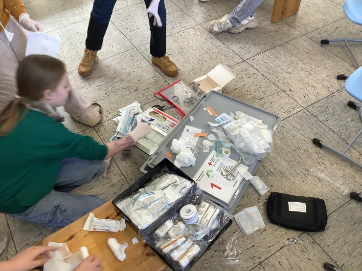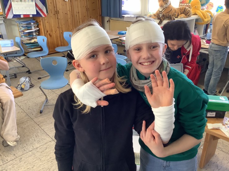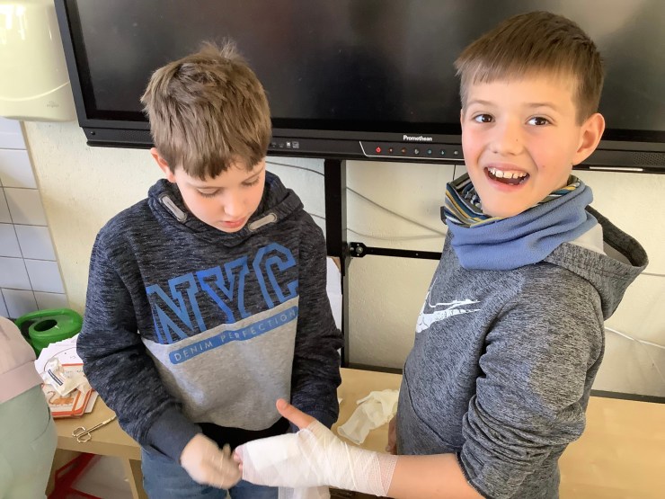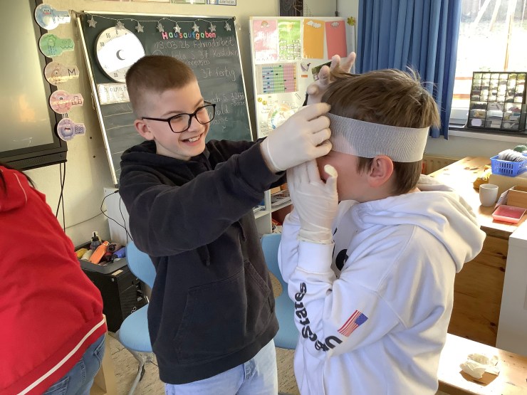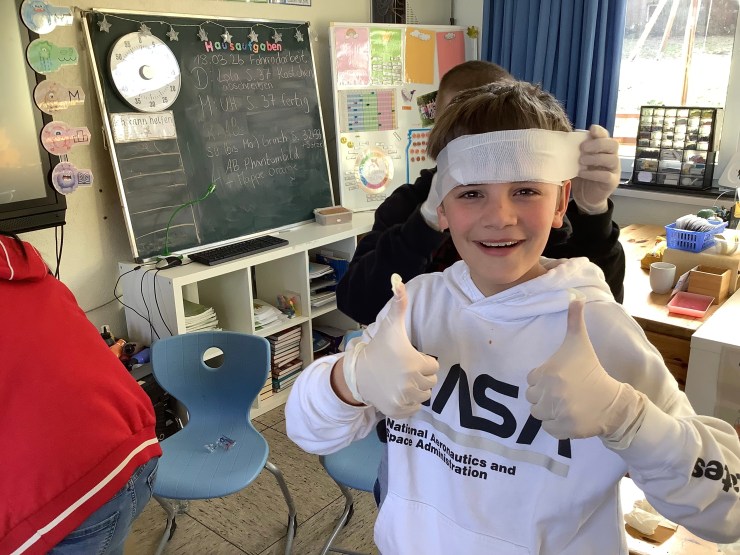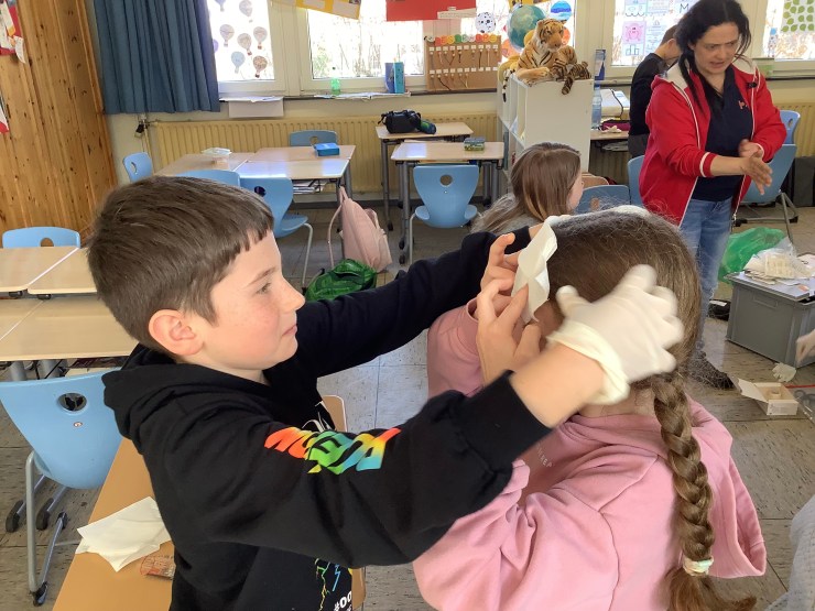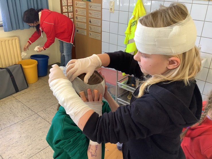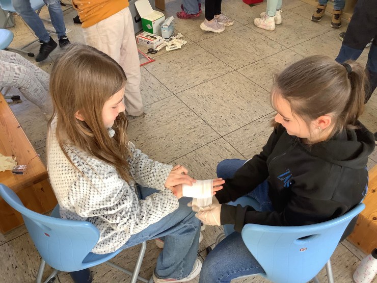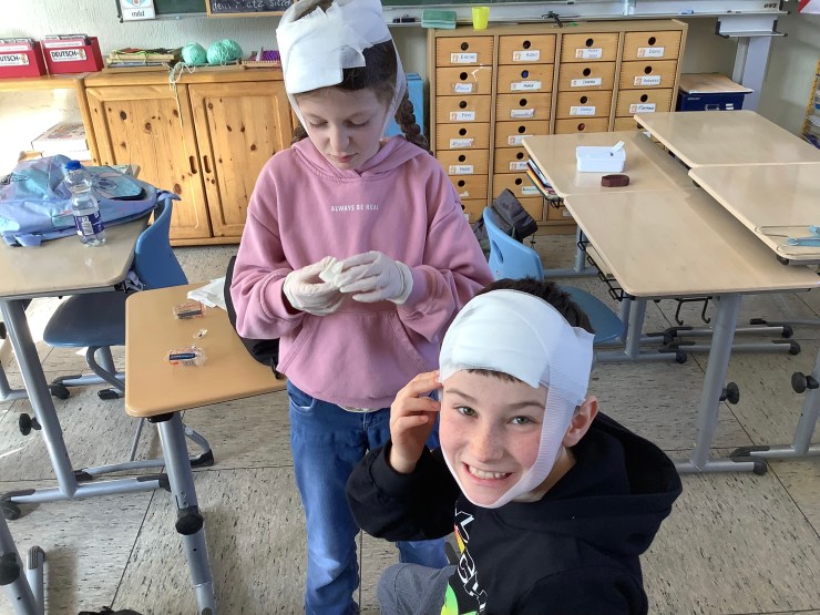 Heute hat uns Ramona vom Deutschen Roten Kreuz besucht und hat mit uns einen Erste-Hilfe-Kurs gemacht, weil wir bald mit dem Fahrradführerschein zu richtigen Verkehrsteilnehmer:innen werden. Wir haben unter anderem über den Notruf gesprochen, haben das Anlegen von Verbänden ausprobiert, die stabile Seitenlage kennengelernt und die Herzdruckmassage trainiert. Mit Hilfe von Ramona konnten wir die Erste-Hilfe-Tasche für unsere Pausenbuddies ausbauen und sind jetzt gut vorbereitet, um anderen zu Helfen.