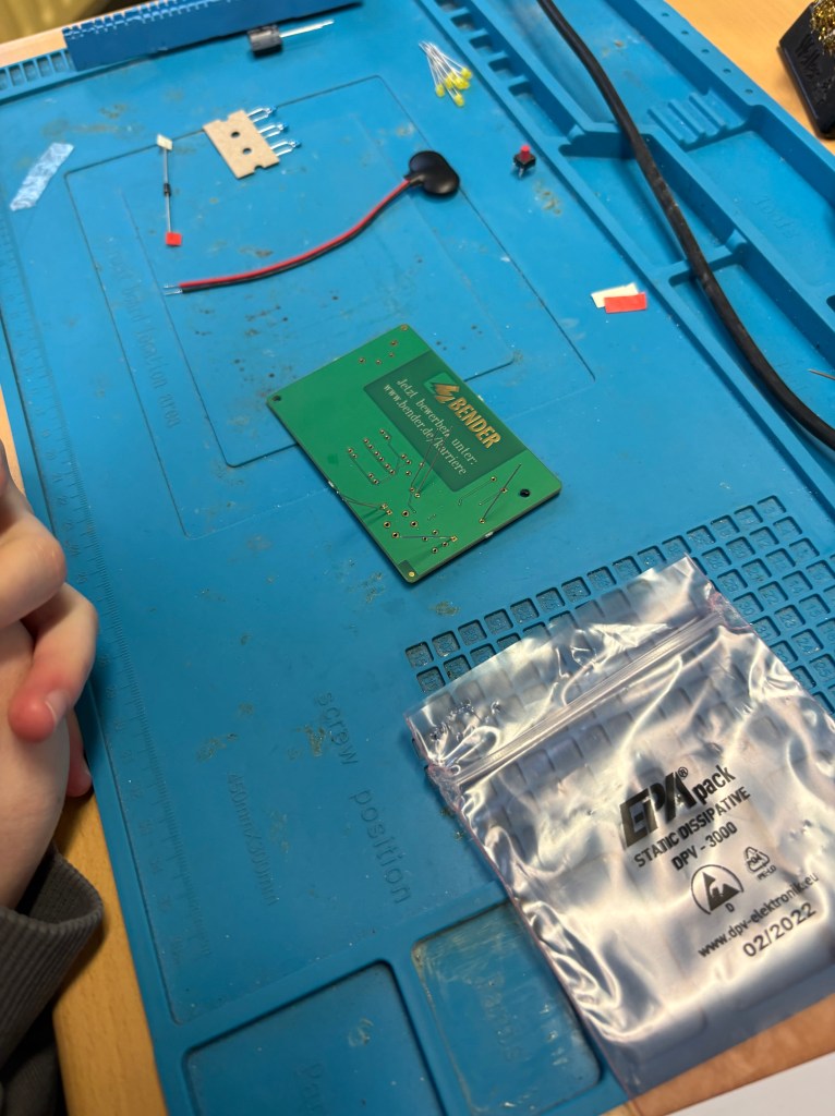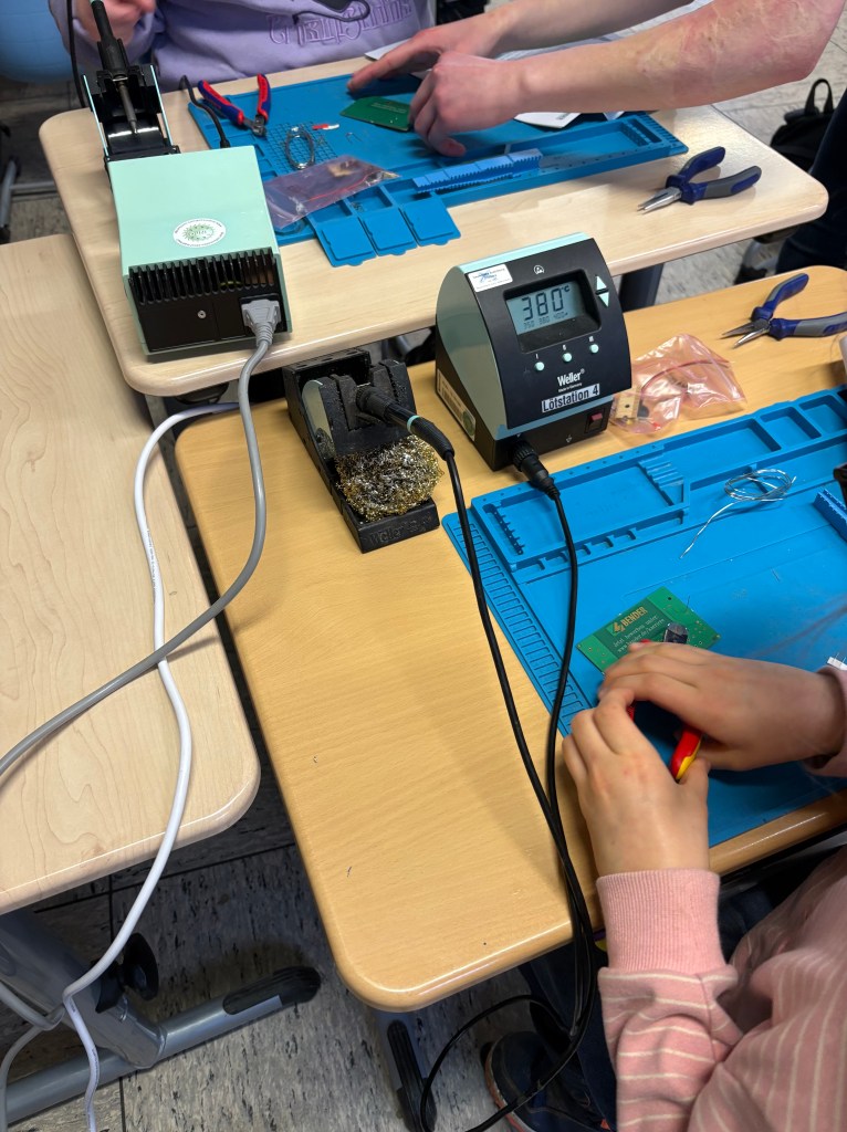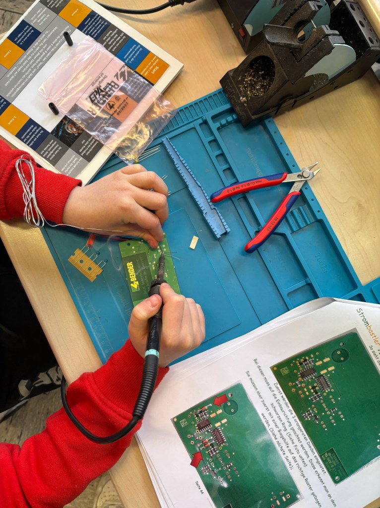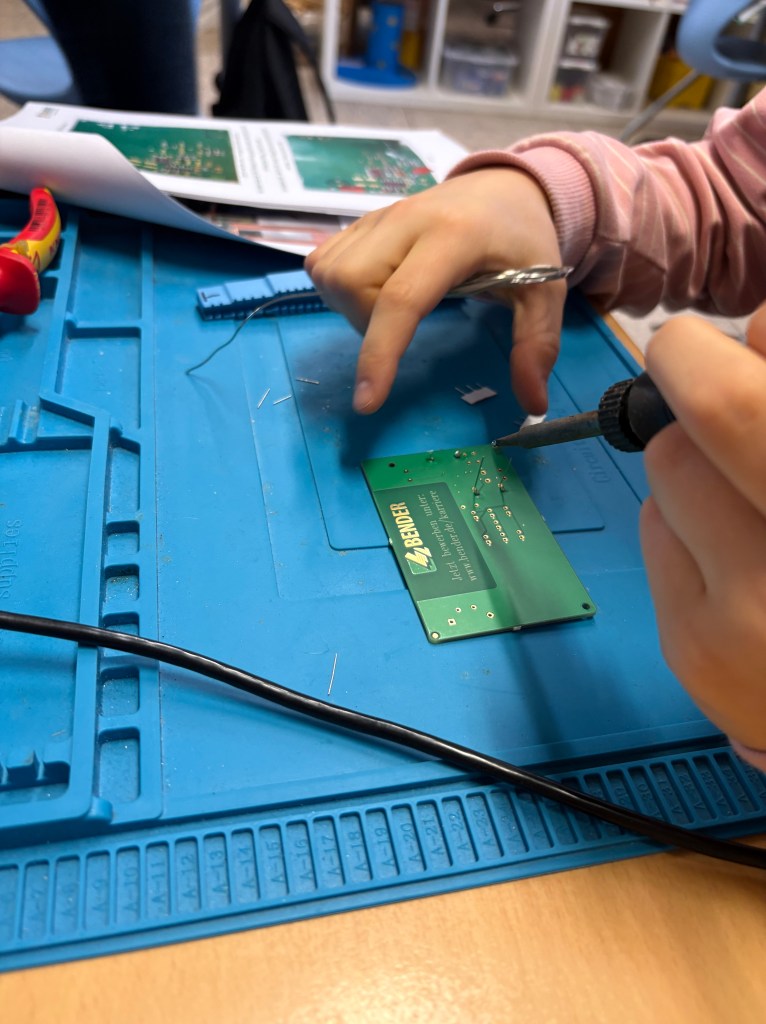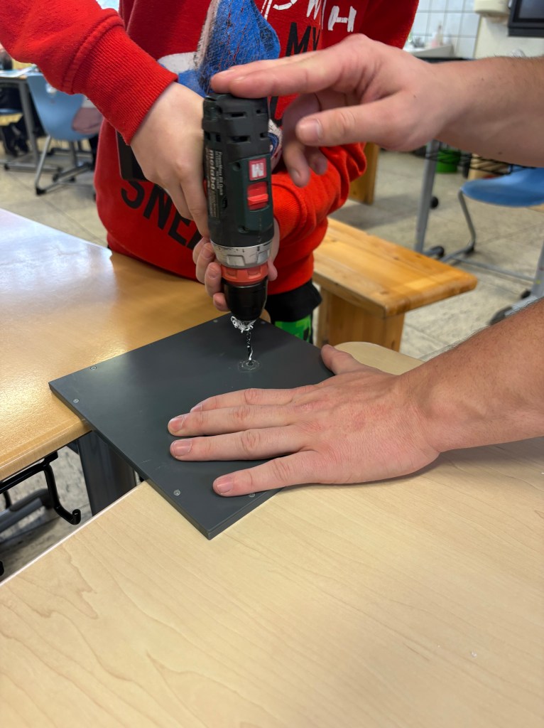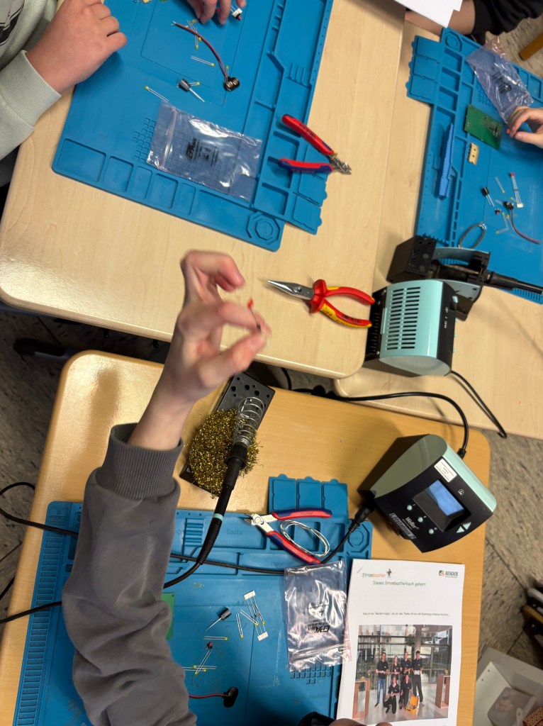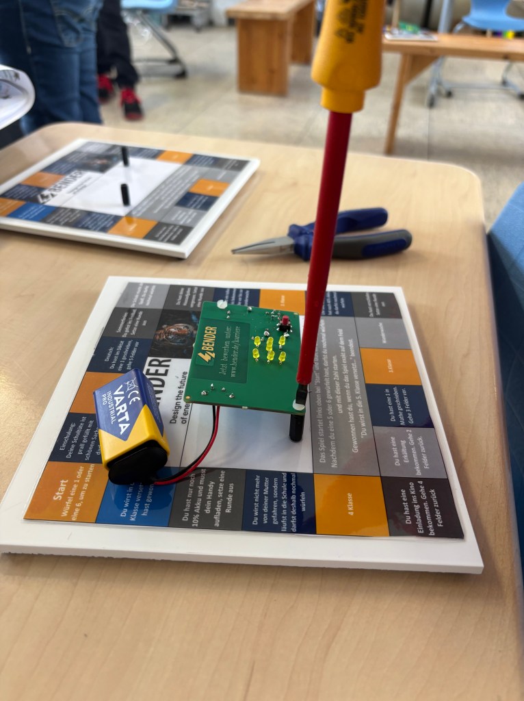 Am 18.02.2026 waren die Azubis der Firma Bender bei uns zu Gast und haben mit uns passend zum Thema Strom ein Spiel mit batteriebetriebenem Würfel gebaut. Dabei mussten wir selber löten, bohren, laminieren und schrauben. Das hat uns wahnsinnig viel Spaß gemacht. Wir bedanken uns noch einmal bei der Firma Bender für den tollen Tag!